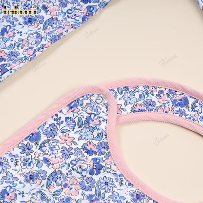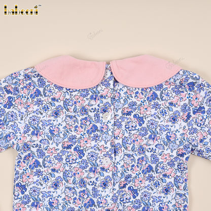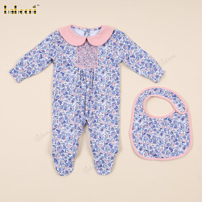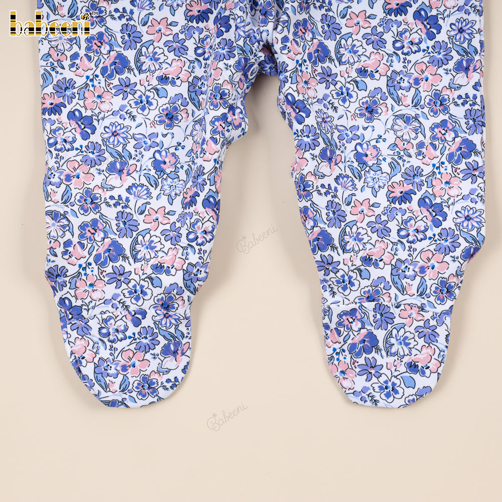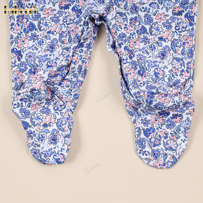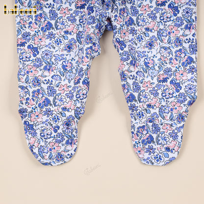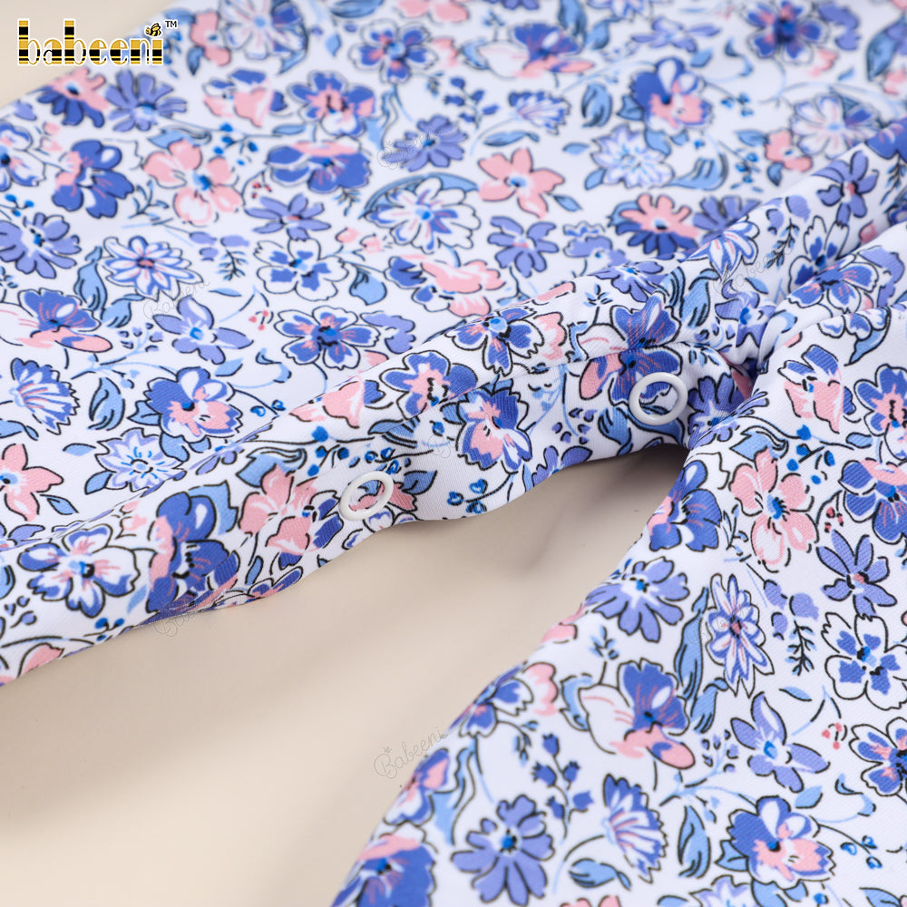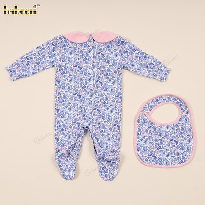 Feature: Sweet and timeless, the VAI006 baby girl footie romper is crafted in a delicate floral print with tones of blue, pink, and lilac. Featuring a soft contrasting pink Peter Pan collar and gathered elastic cuffs for comfort, this footie is as practical as it is adorable. The romper comes with a coordinating bib in matching fabric trimmed in pastel pink for a complete, polished look.