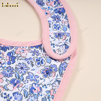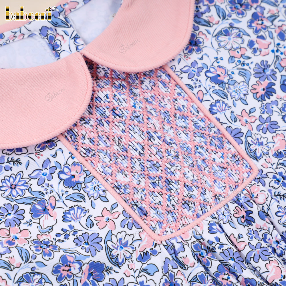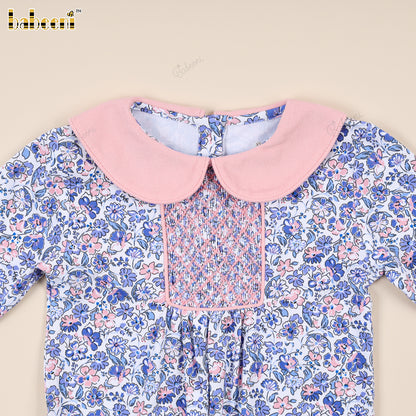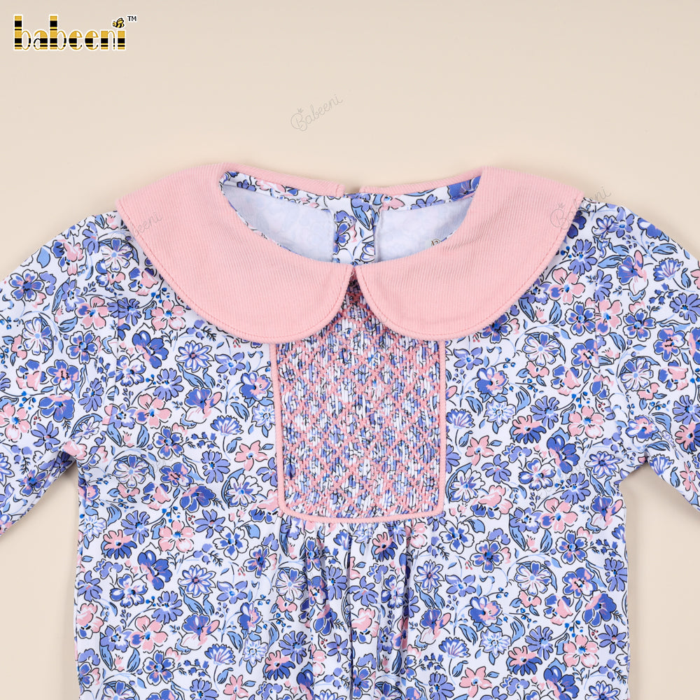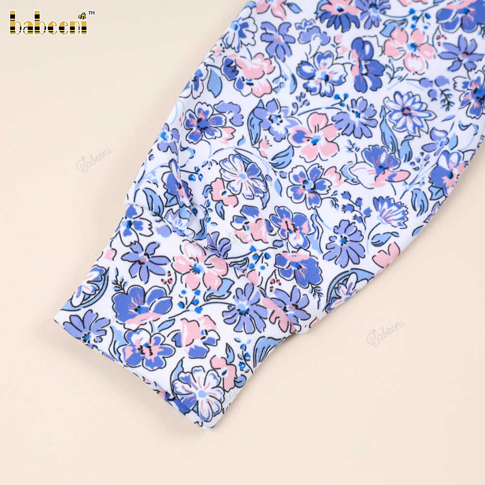 Feature: Sweet and timeless, the VAI006 baby girl footie romper is crafted in a delicate floral print with tones of blue, pink, and lilac. Featuring a soft contrasting pink Peter Pan collar and gathered elastic cuffs for comfort, this footie is as practical as it is adorable. The romper comes with a coordinating bib in matching fabric trimmed in pastel pink for a complete, polished look.