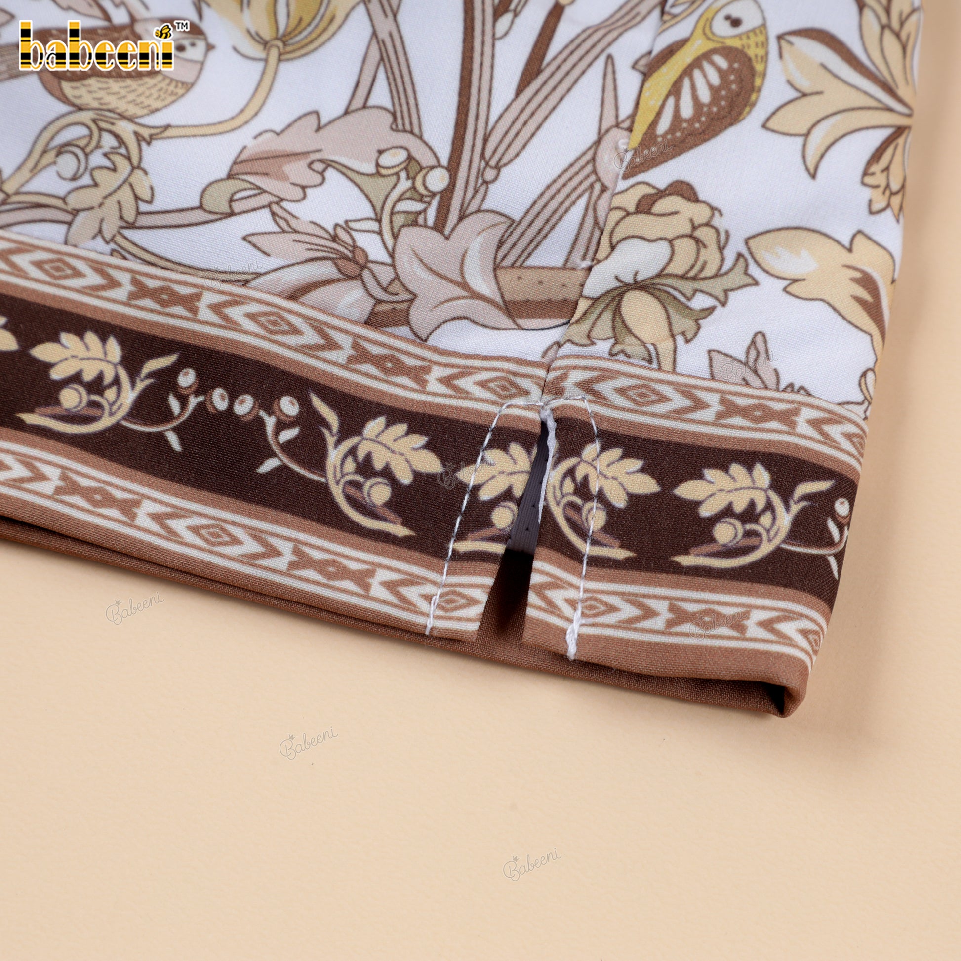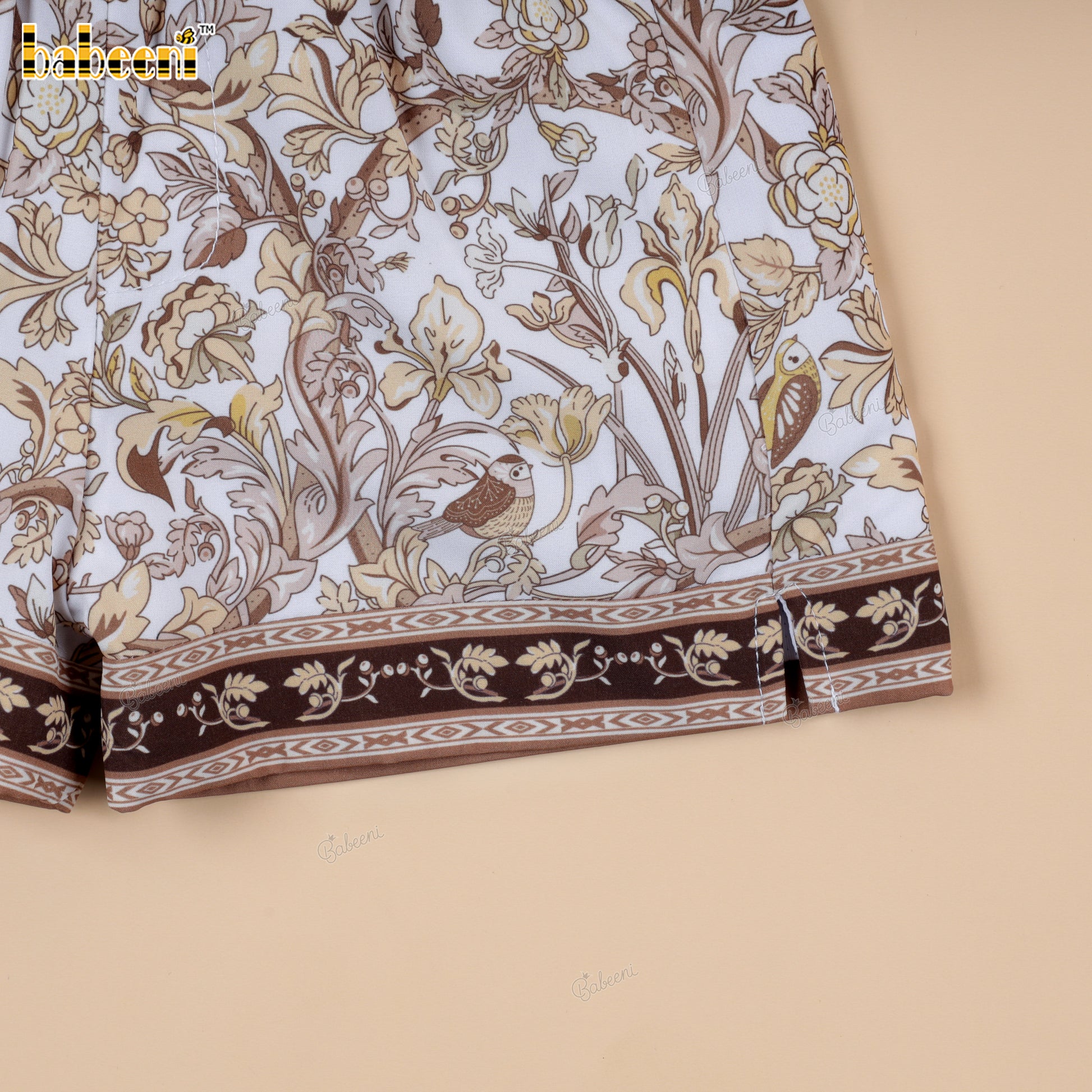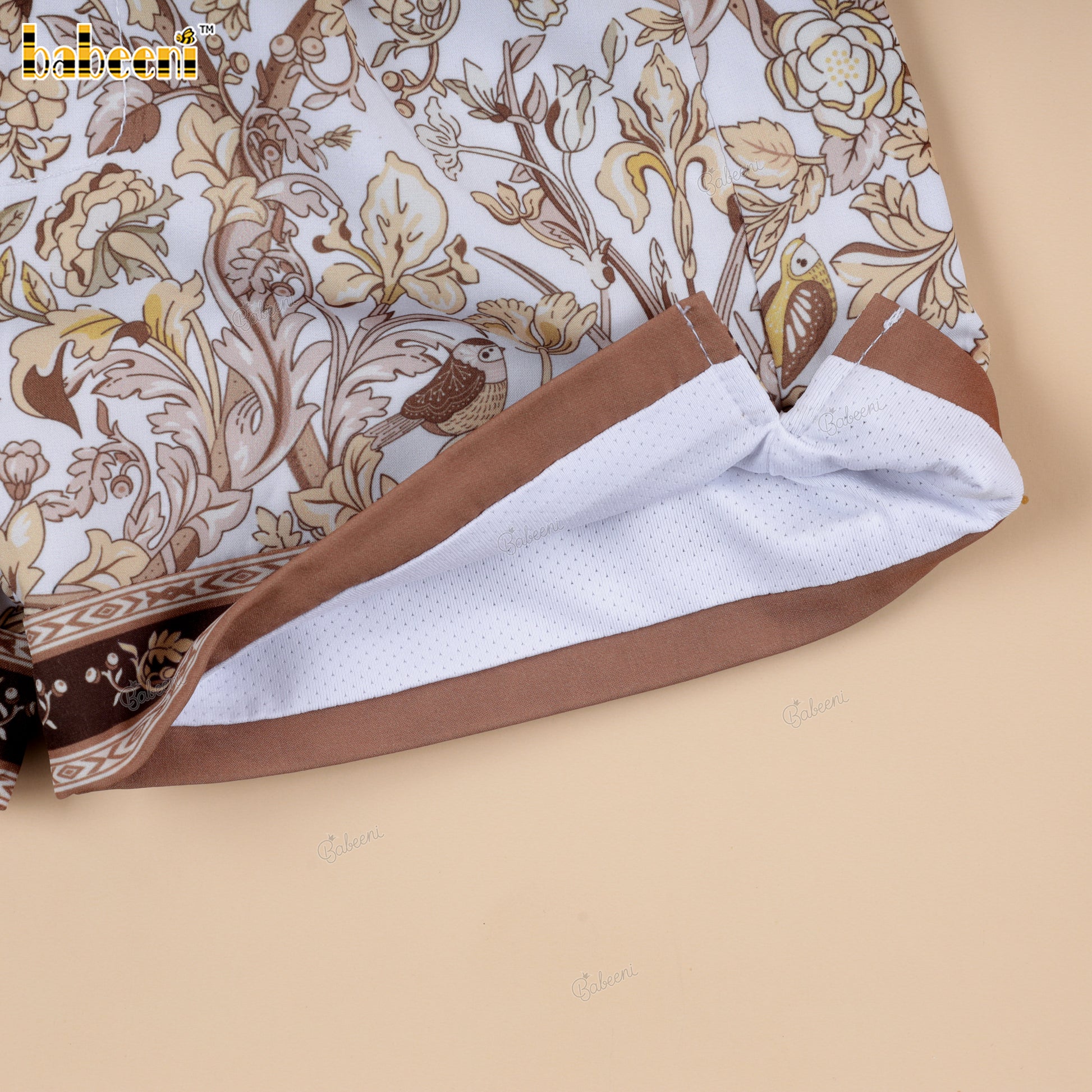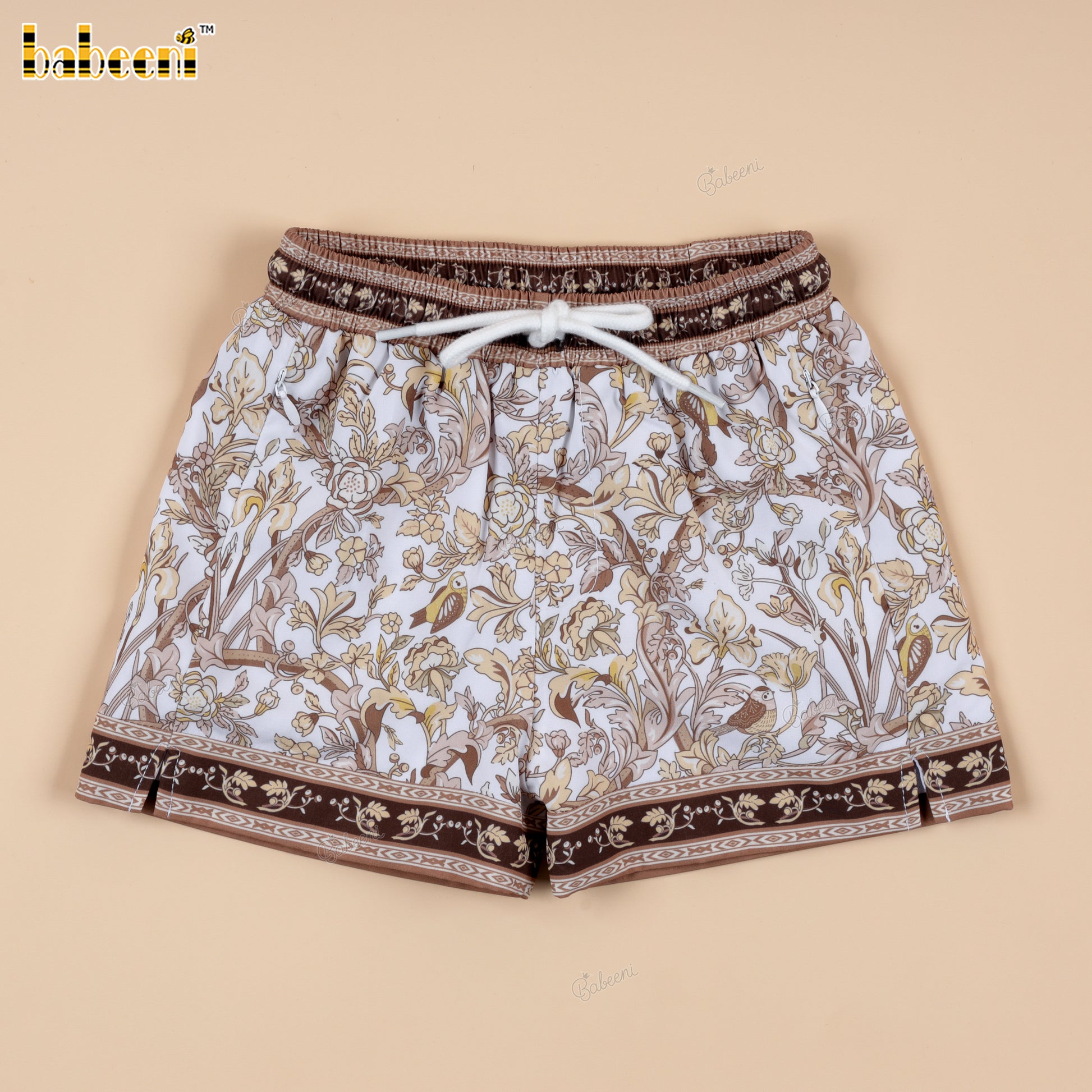 Feature: Boys’ swim shorts featuring a white base covered in dense baroque floral motifs in warm gold and soft brown tones. Accented with matching ornate trims at the waistband and hem, creating a rich, vintage-inspired look. Finished with a white drawstring and clean silhouette for comfort and easy movement.