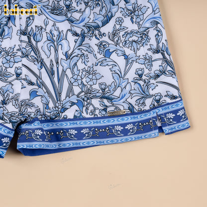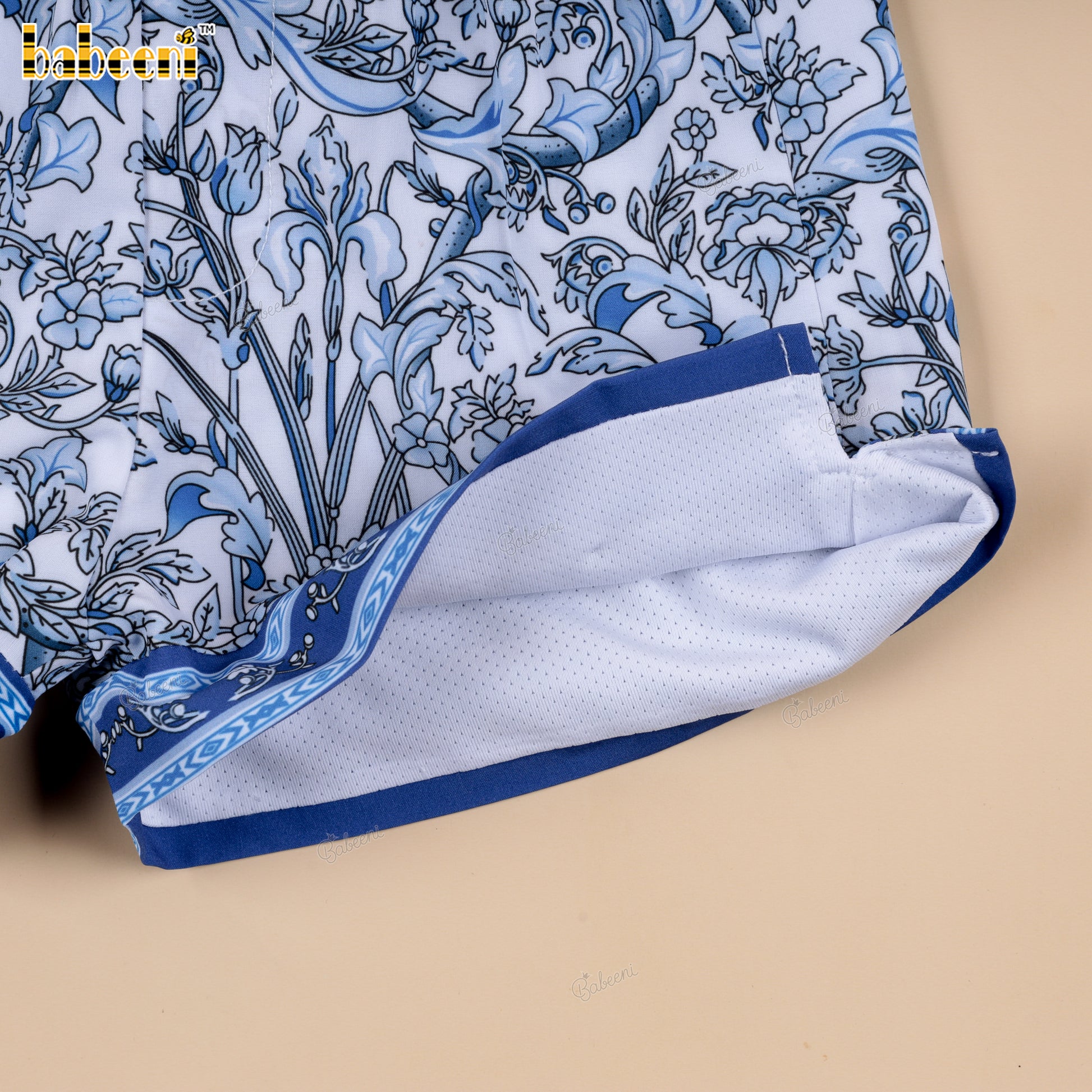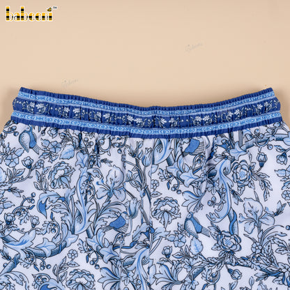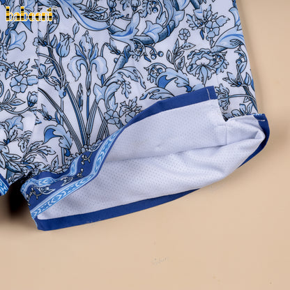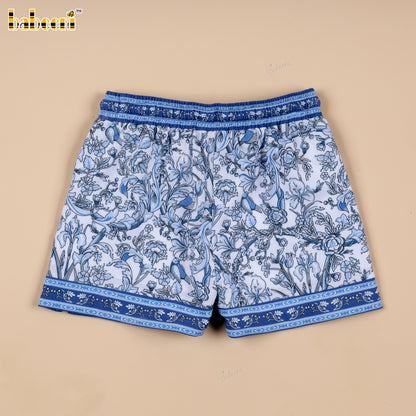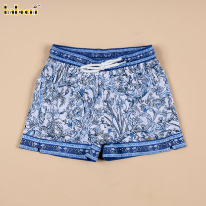 Feature: Boys’ swim shorts featuring a crisp white base printed with dense blue floral motifs for a fresh, summery look. Finished with coordinated blue custom trims at the waistband and hem, a white drawstring, and functional side slits for easy movement. Designed to stand out through color contrast and print clarity.