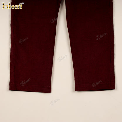 Feature: This classic boys’ set combines comfort and sophistication. The soft piqué shirt offers a breathable, lightly textured finish with a polished look. It pairs perfectly with rich burgundy corduroy pants that add depth and seasonal warmth. Ideal for fall/winter dressing, holiday events, or boutique collections.