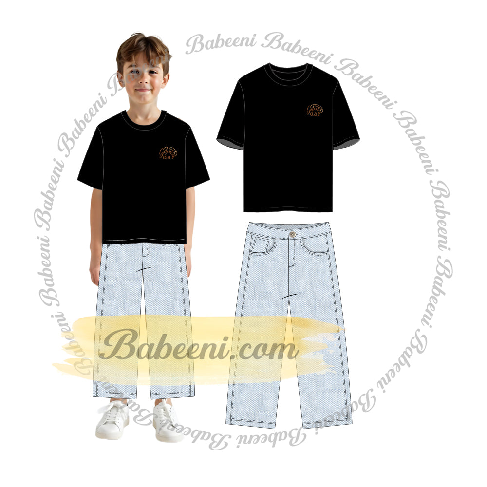 Feature: A bold and casual everyday outfit for active boys. The oversized black t-shirt offers comfort and freedom of movement, highlighted by a playful embroidery detail on the chest. It’s paired with light-washed jeans that bring a dynamic and youthful look, perfect for school or weekend fun.