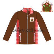Feature: Lovely brown coat for girls with adorable candy house embroidered on smocked pattern. Red and white plaid fabric runs along the flanks. Zip pockets on sides.