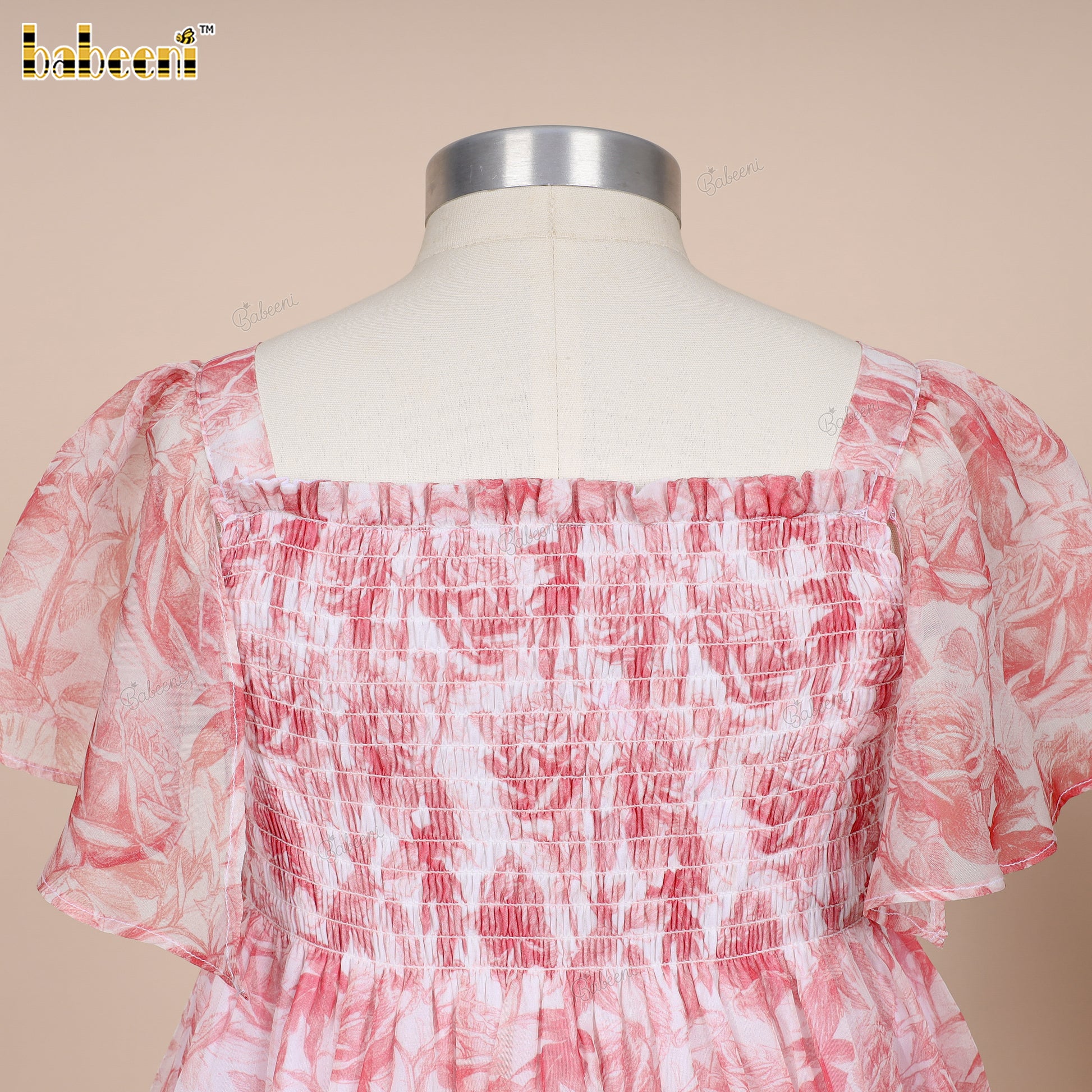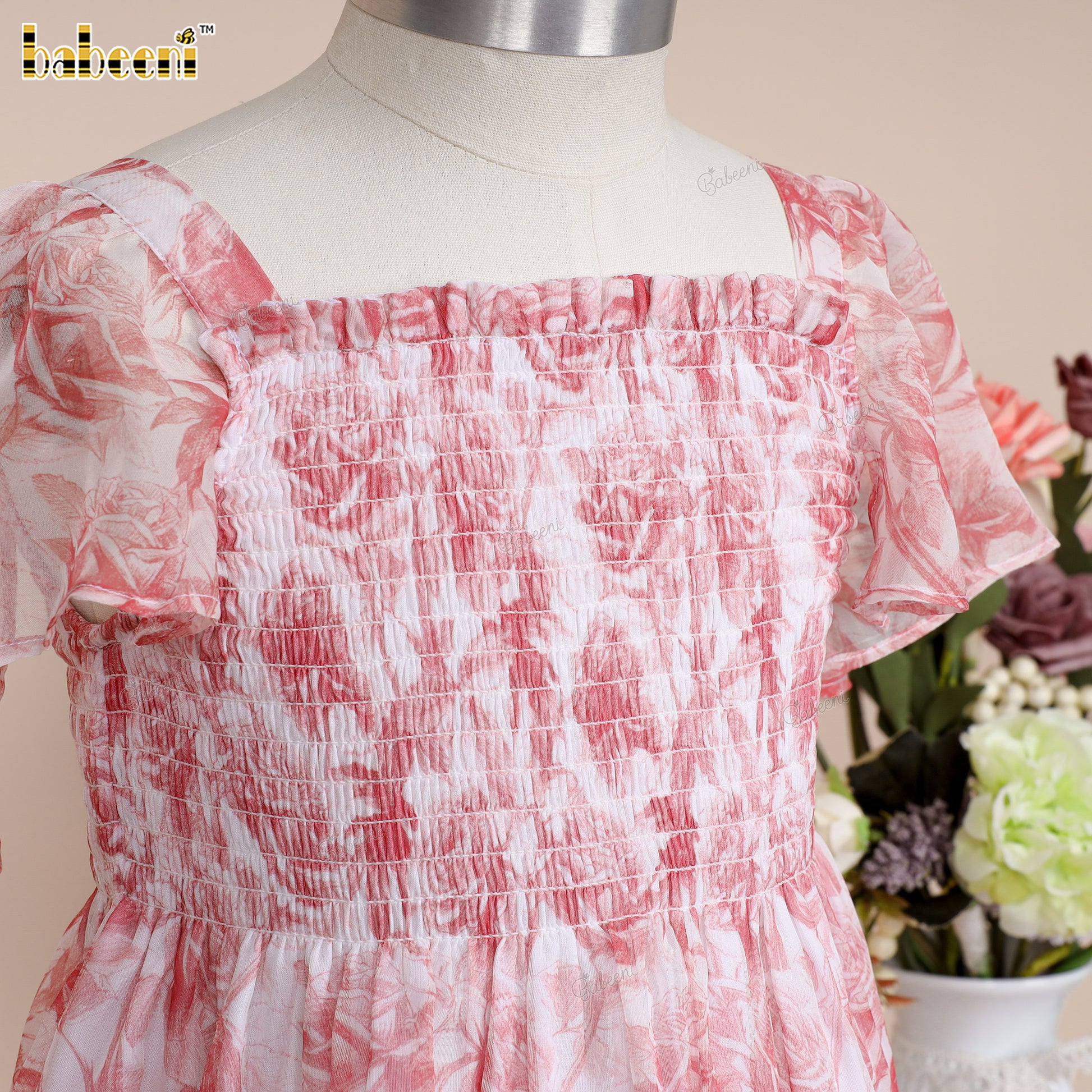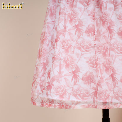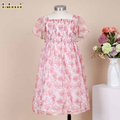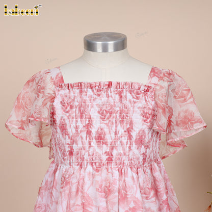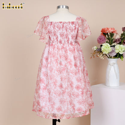 Feature: Adorable flared dress in soft ECO-printed voile, detailed with Kansai elastic smocking on the chest and charming puff sleeves, perfect for a breezy summer look.