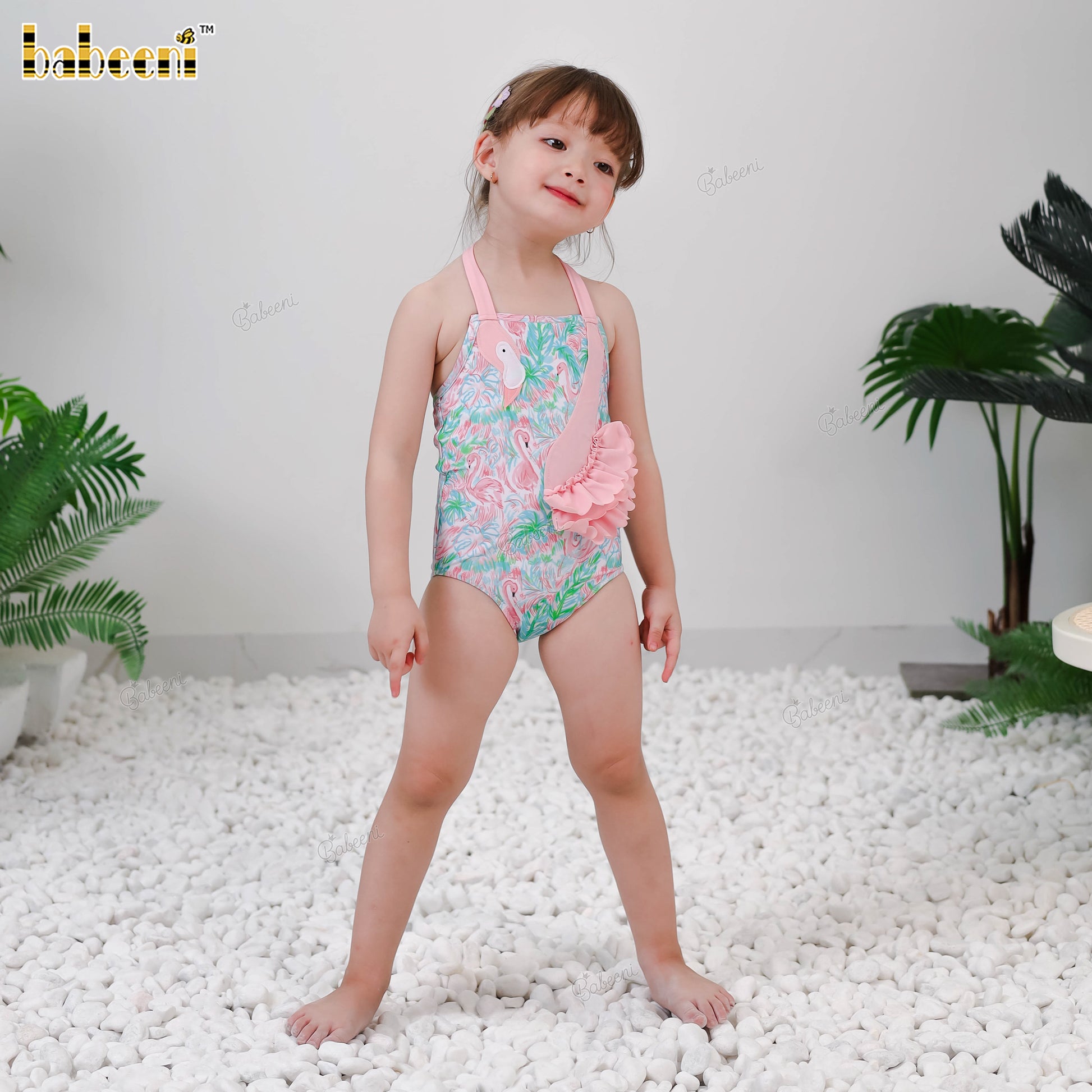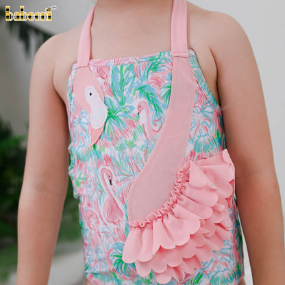 Features: Bursting with color and fun, this one-piece swimsuit showcases a lively neon flamingo and palm print that captures the joy of summer. The adjustable halter neckline ensures a secure and comfortable fit, while the soft, stretchy swim fabric provides ease of movement in and out of the water. A standout 3D flamingo appliqué, crafted with layered embroidery and textured stitching, adds a playful, eye-catching touch. Quick-drying and gentle on the skin, this swimsuit keeps your little girl cool, comfy, and stylish for sunny pool parties or beach adventures.
