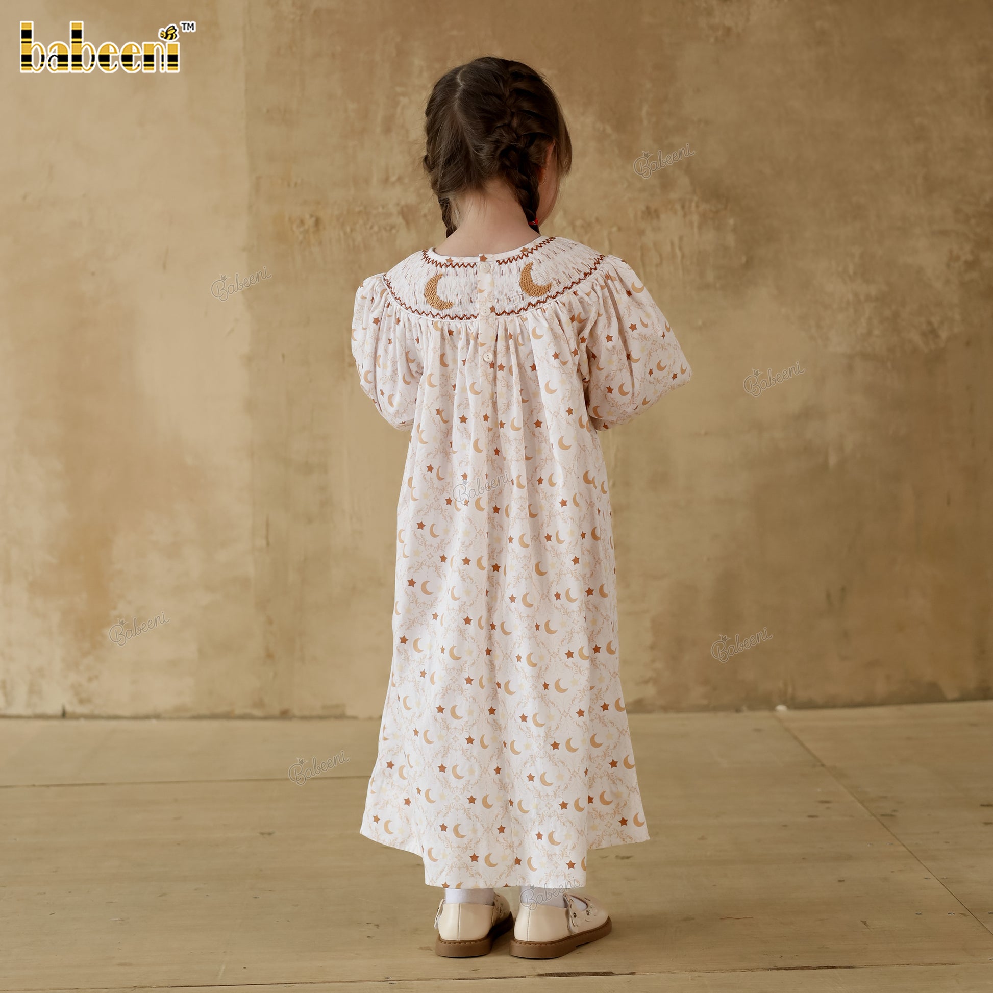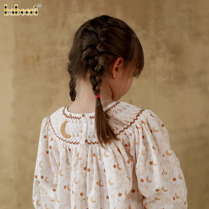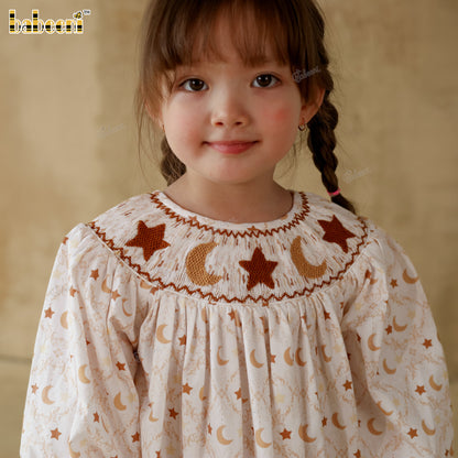 Feature: A charming bishop dress featuring moon-and-star eco print on textured cotton twill. The hand-smocked neckline is delicately embroidered for a refined finish, while the gathered sleeves and softly flared hem create a light, graceful silhouette—perfect for everyday wear or festive occasions.