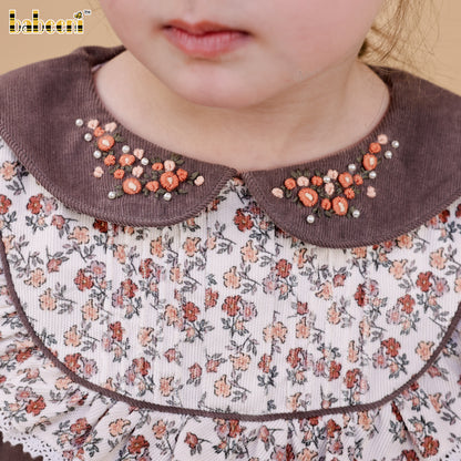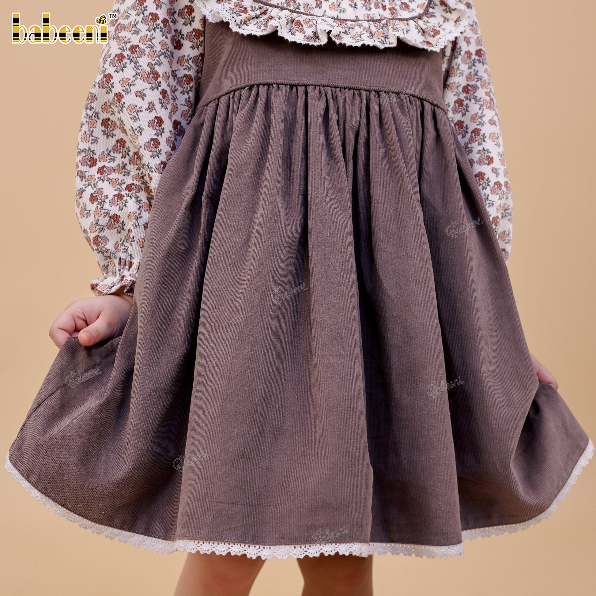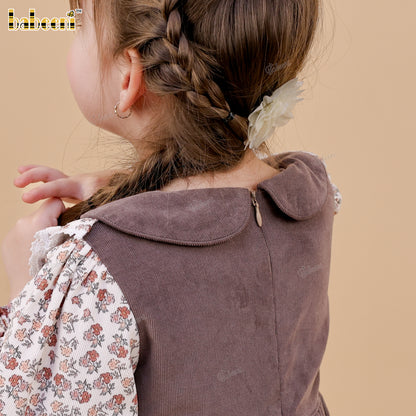Feature: A girls’ A-line dress crafted in soft corduroy with delicate autumn petal floral print sleeves.