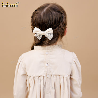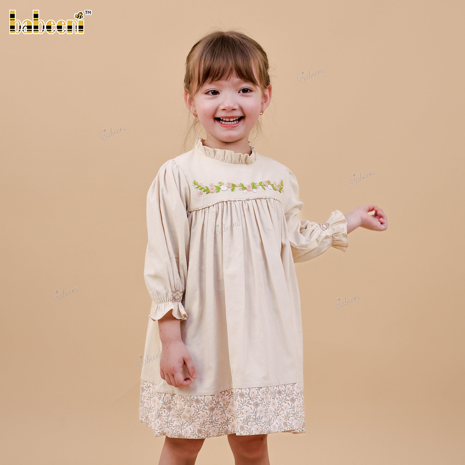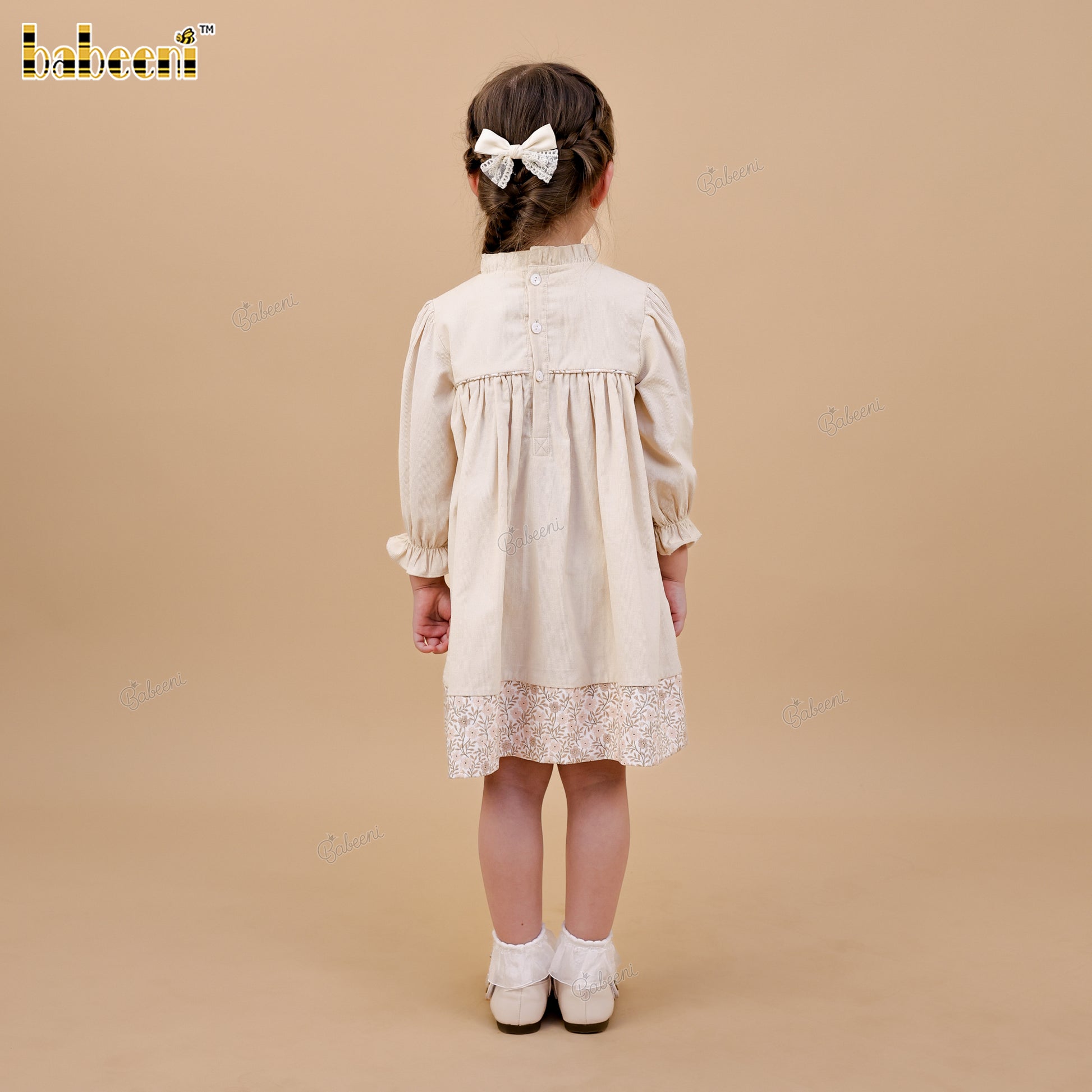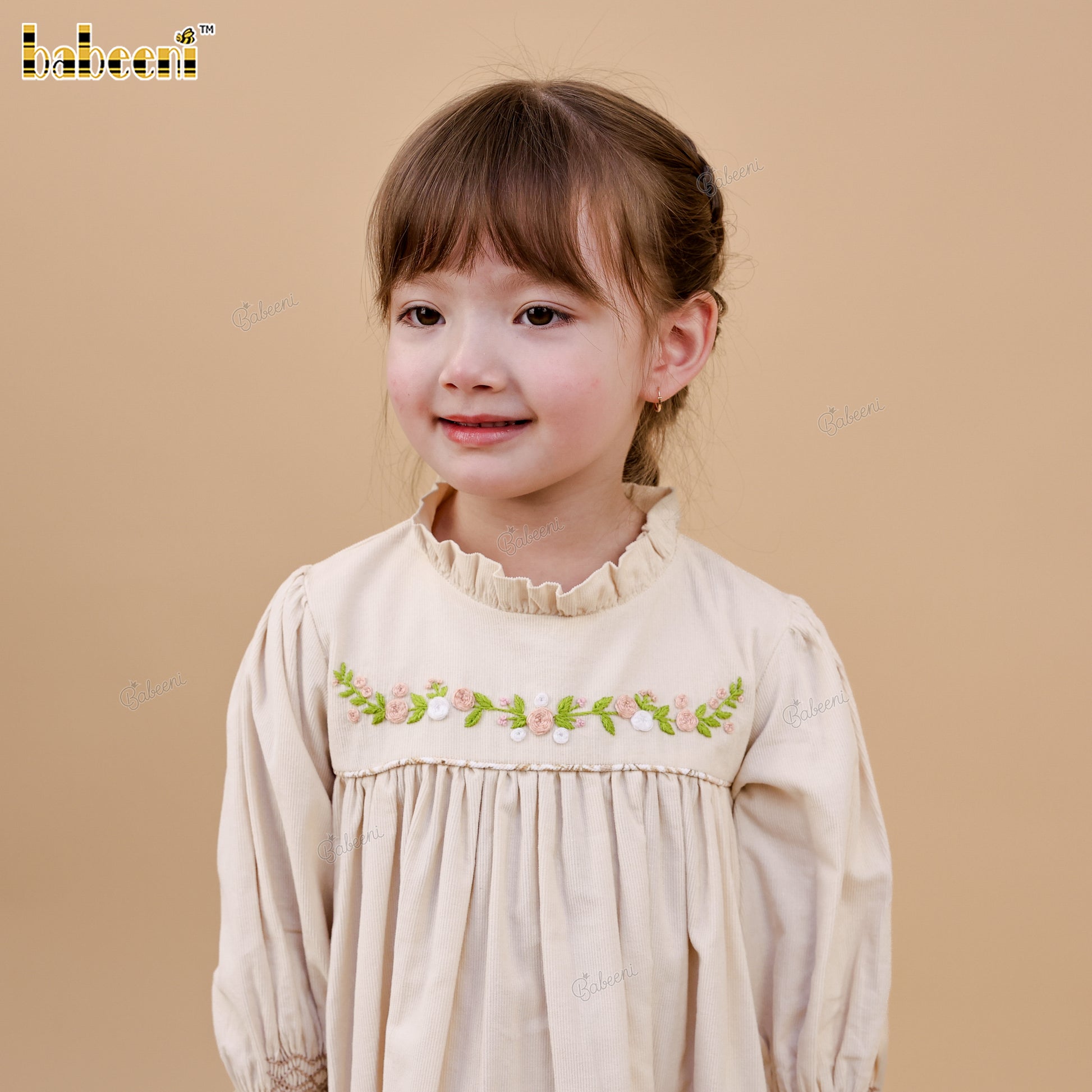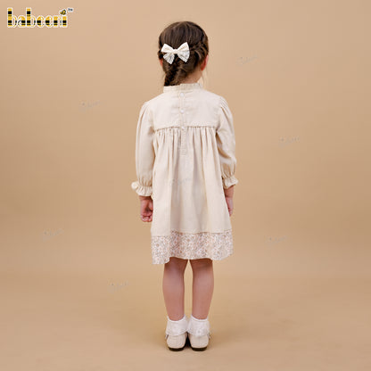 Feature: A soft A-line girls’ dress crafted from lightweight velvet, accented with delicate meadow floral eco print. Hand-smocked details at the neckline and gently puffed sleeves with smock cuffs create a graceful, timeless silhouette—perfect for Fall Winter collections.