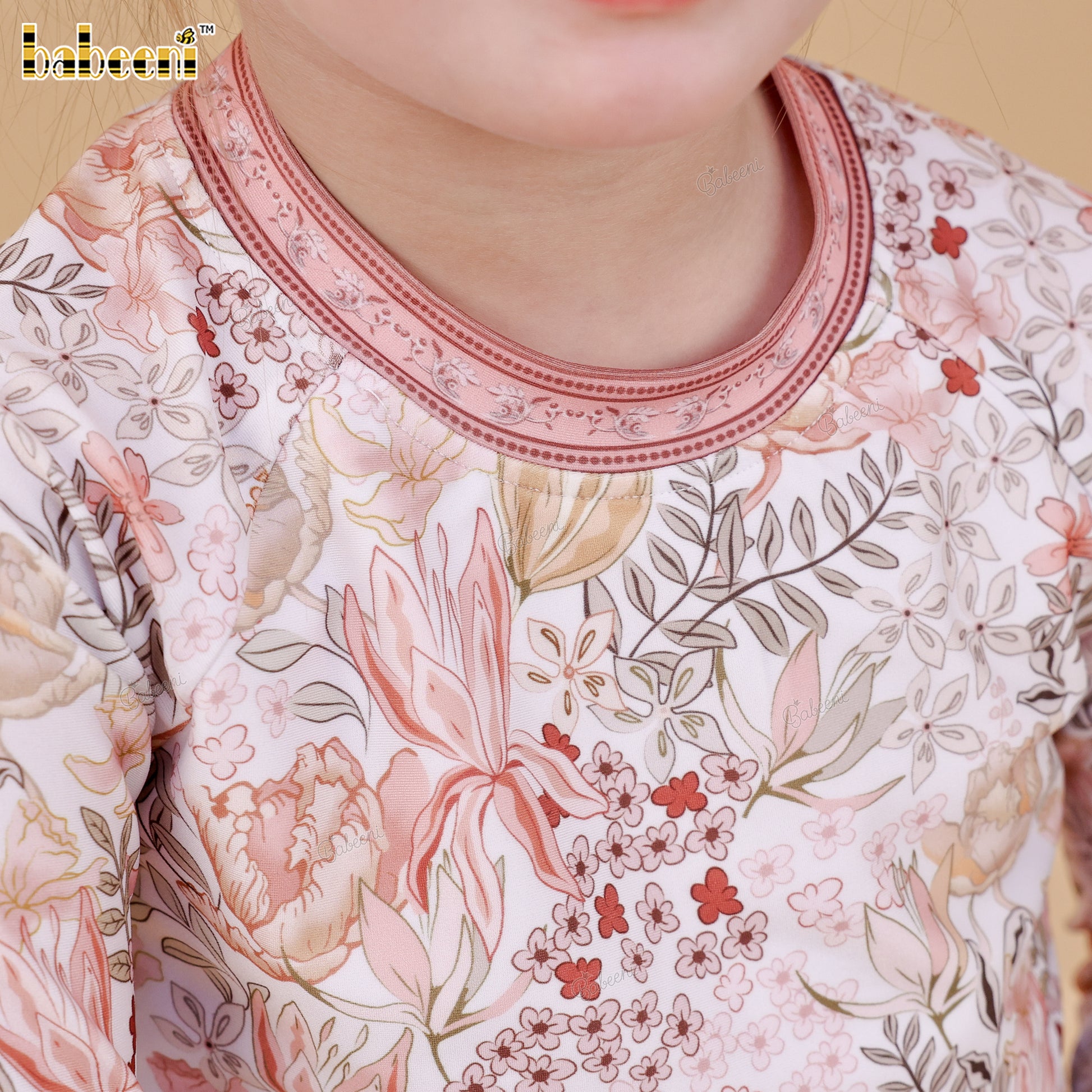 Finished with coordinated printed trims at the neckline, sleeves, and waist for a cohesive seasonal look.