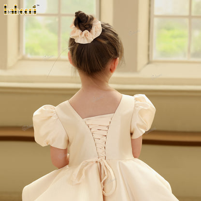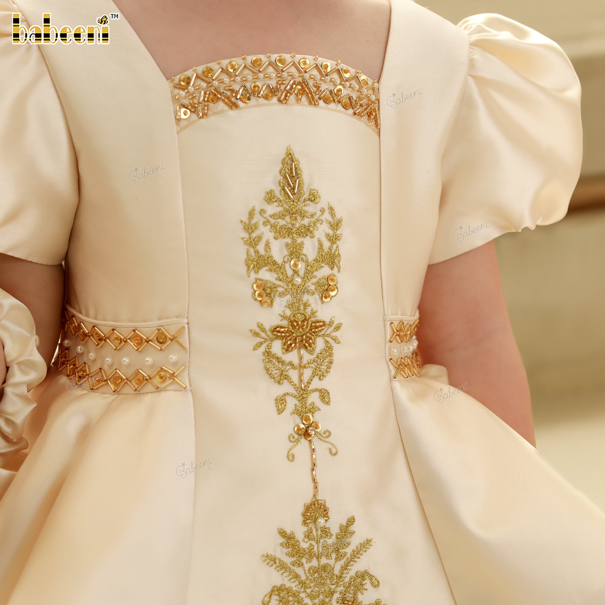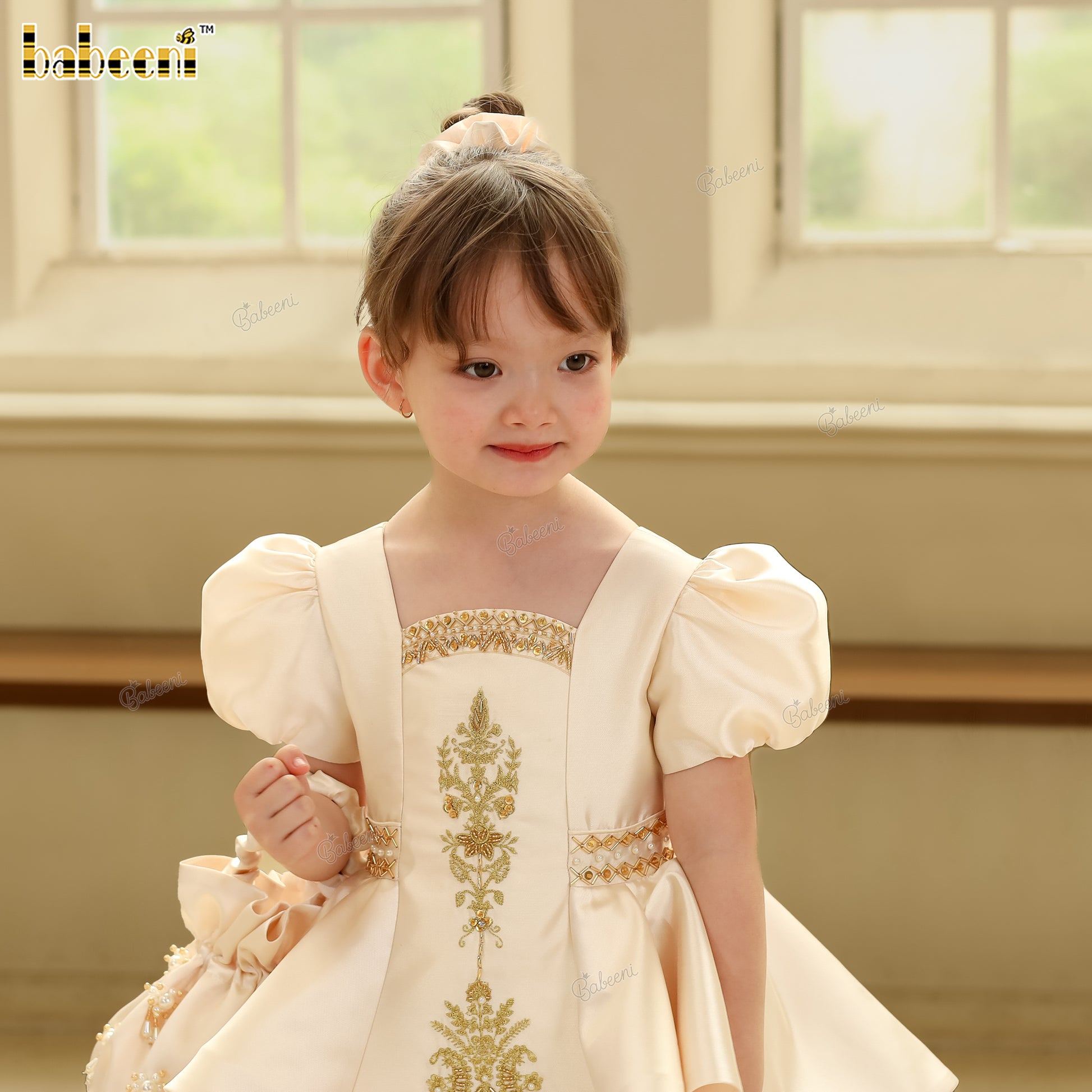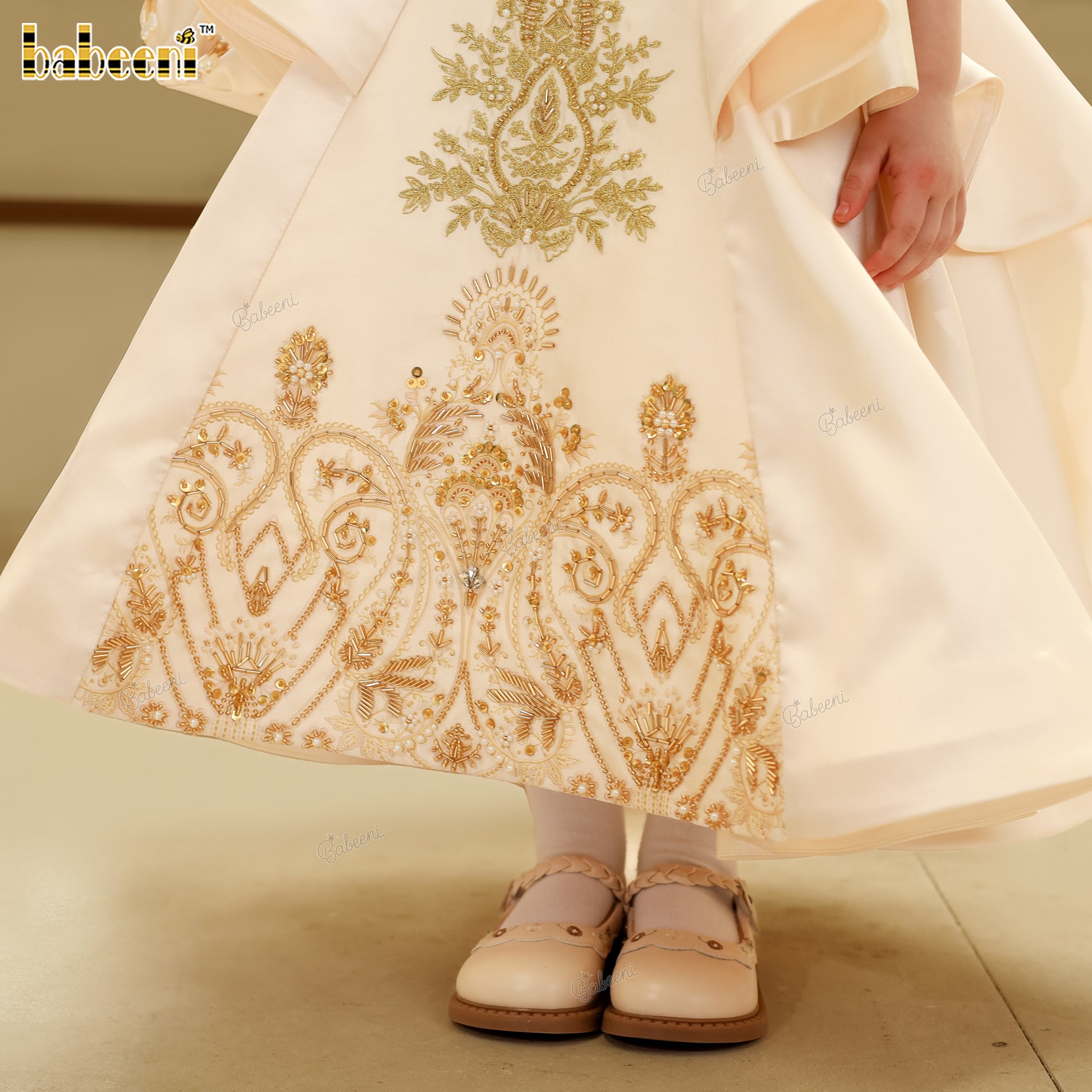 Feature: Inspired by elegant Arabesque motifs from Dubai, this exquisite cream taffeta dress blends timeless charm with modern grace. The puff sleeves and layered skirt create a soft, royal silhouette, while subtle embroidery and delicate textures highlight its sophistication. Perfect for weddings, celebrations, or formal events, this refined design captures true luxury and elegance.