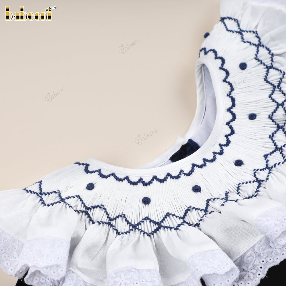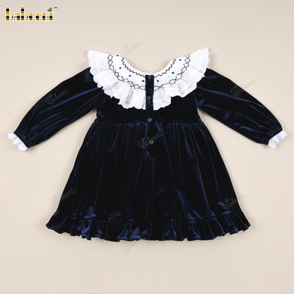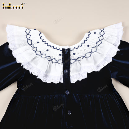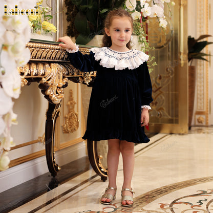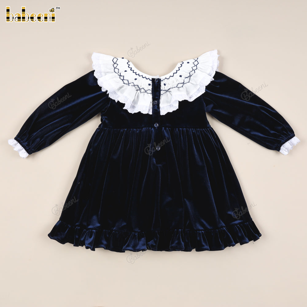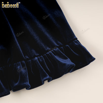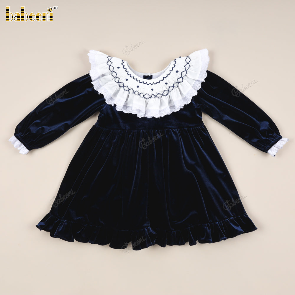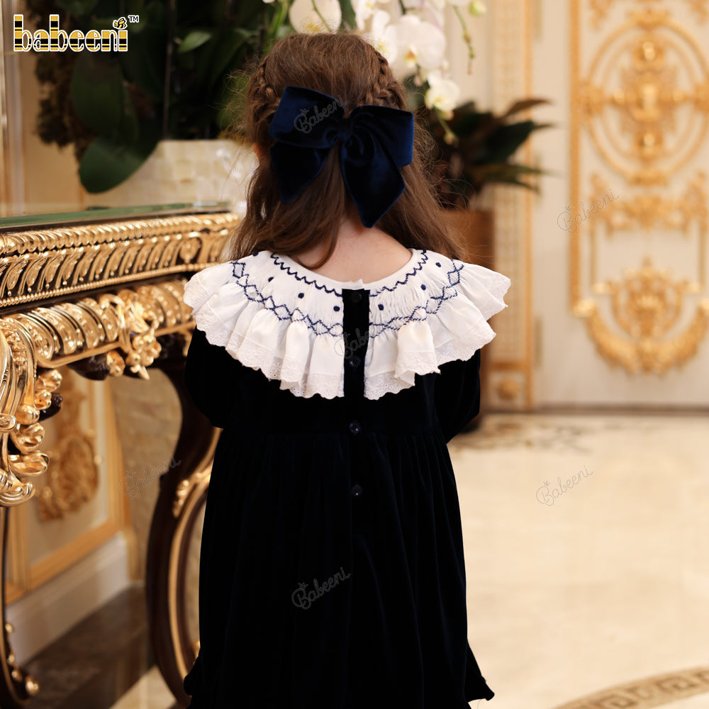 Feature: This beautifully crafted flared velvet dress combines classic craftsmanship with romantic details. It features hand-smocked embroidery on the chest, delicate lace accents, and a soft ruffled hem that adds movement and charm. A perfect piece for special occasions, holiday photos, or premium boutique collections.