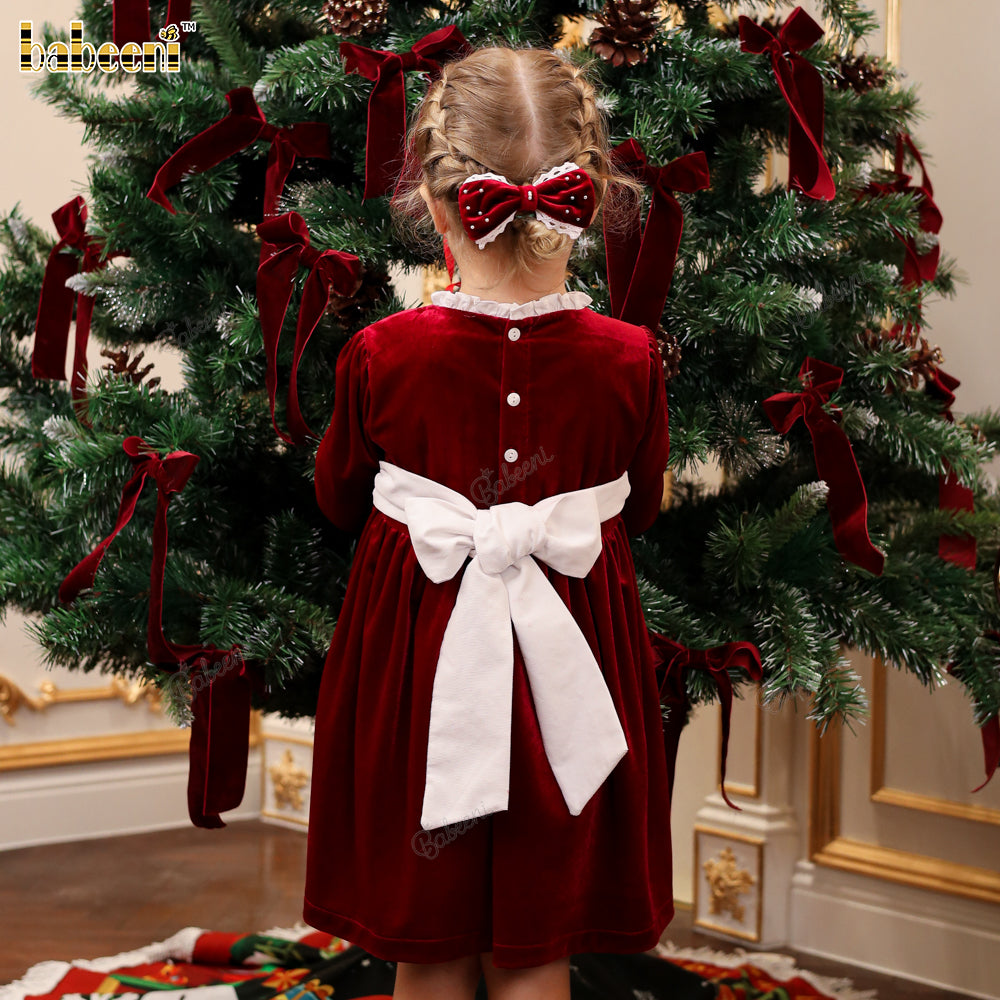 Features: Crafted for the holiday season, this elegant red velvet dress captures timeless charm and festive joy. Ruffled white corduroy cuffs and neckline add delicate contrast, while the back features a sweet velvet bow. The sleeves are adorned with exquisite hand embroidery, pearl beads, and Babeeni's signature red bow details for a distinctive holiday statement.