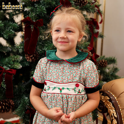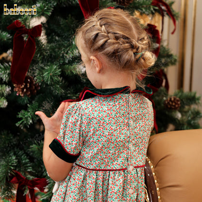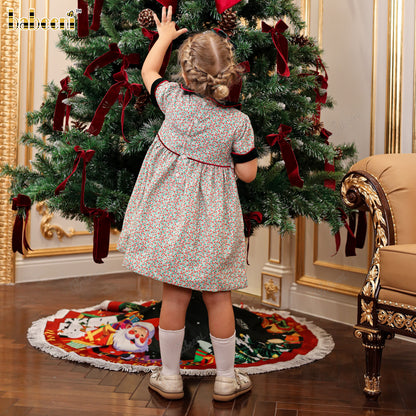 Features: This flared holiday dress is crafted from lightweight printed corduroy, featuring a quilted velvet collar and velvet-trimmed sleeves. Delicate hand embroidery decorates the chest area, accented with sparkling pearl beads. A soft white bow ties neatly at the back, adding a graceful finishing touch. Perfect for festive occasions and winter celebrations.