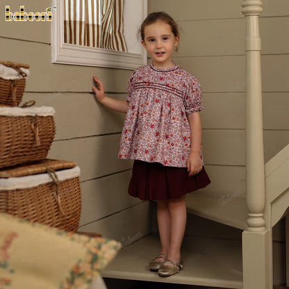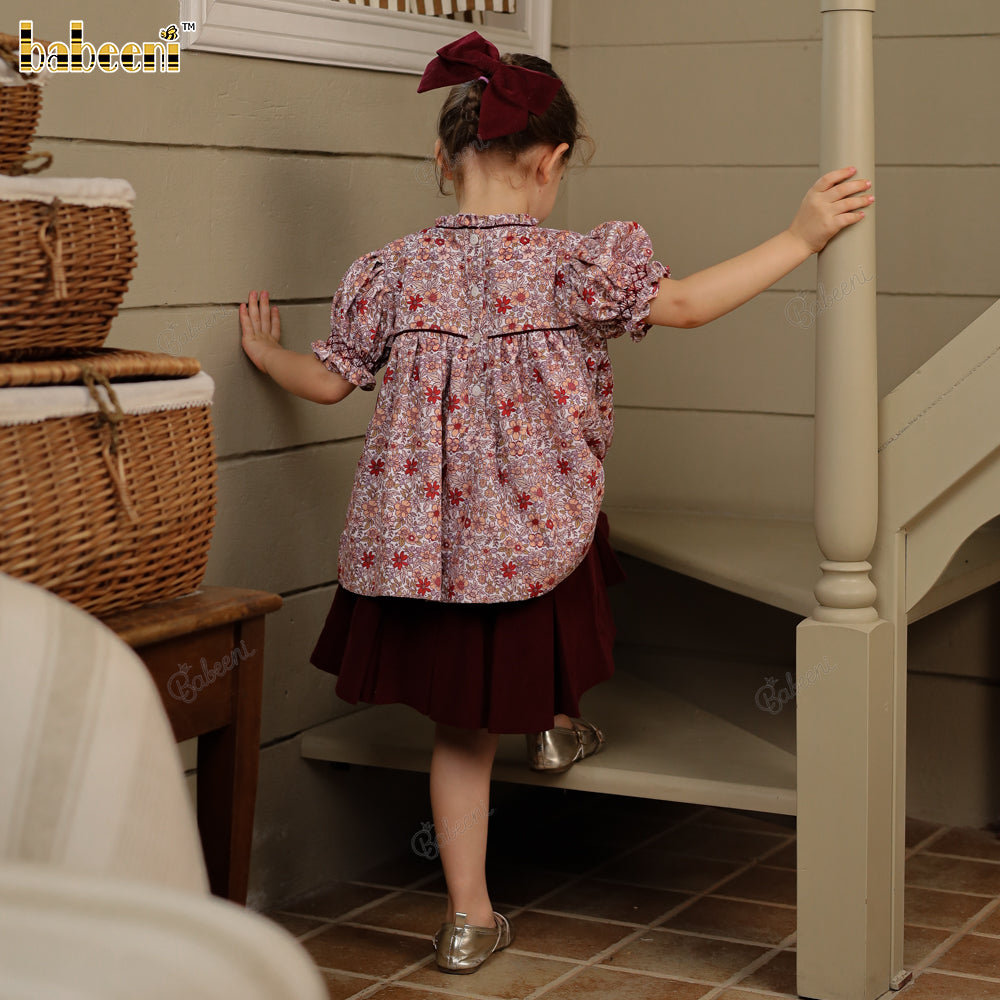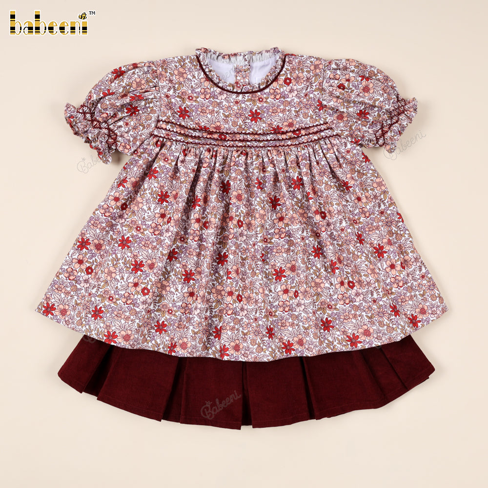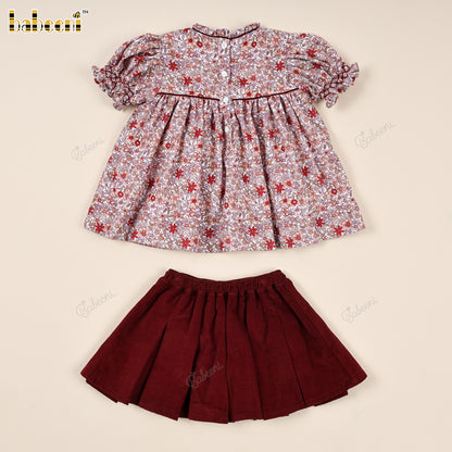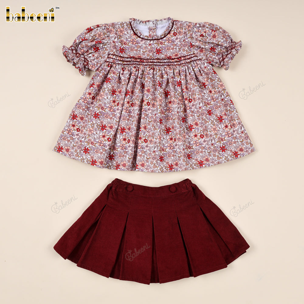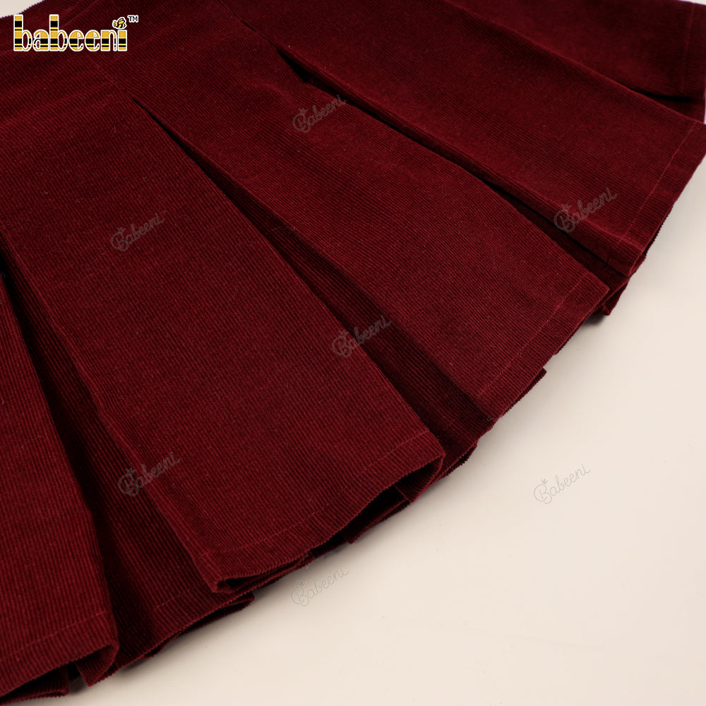 Feature: A classic yet contemporary outfit for girls, this coordinated set features a corduroy A-line top with stylish zigzag pleats, a ruffled collar, and hand-smocked cuffs. Paired with a rich velvet pleated skirt that comes with built-in cotton shorts for comfort and modesty. Perfect for holiday events, family gatherings, or boutique collections