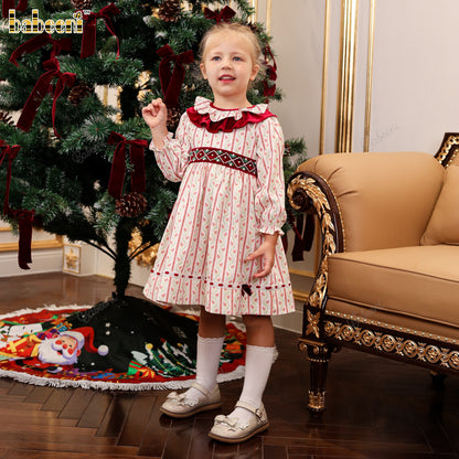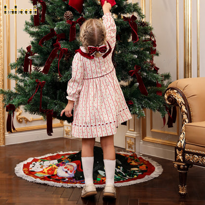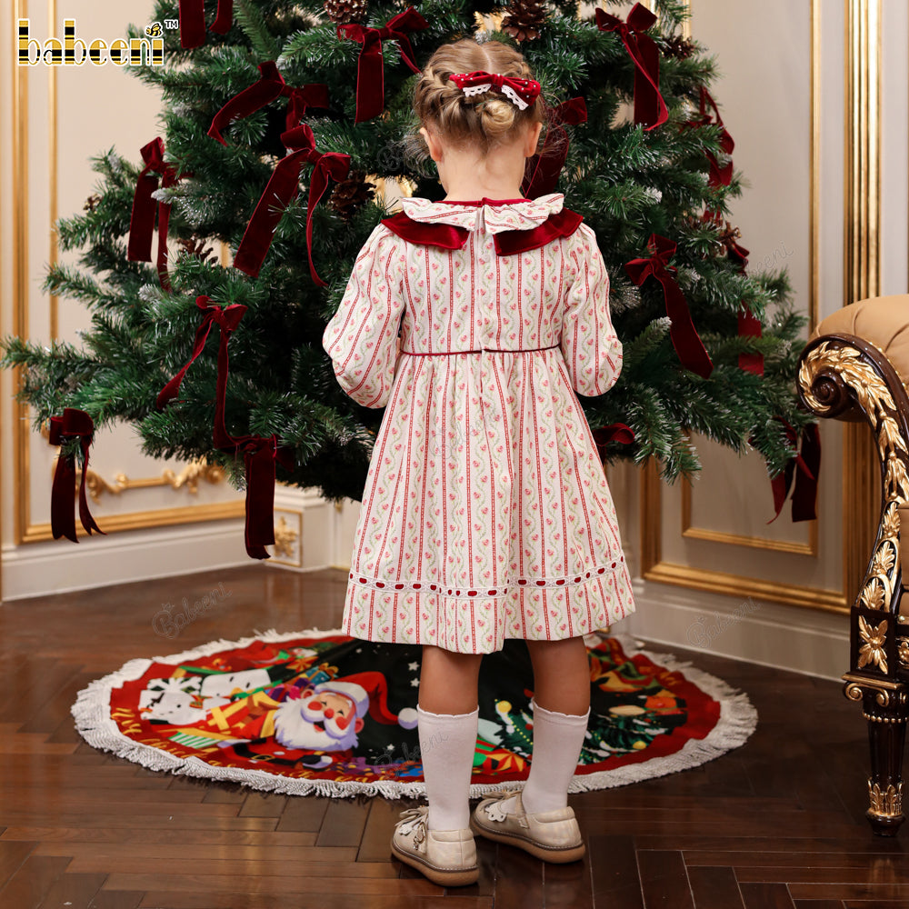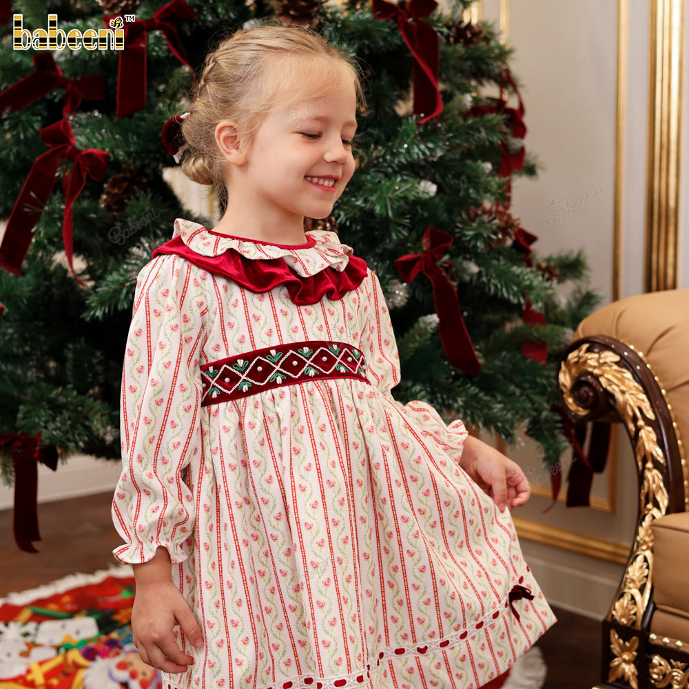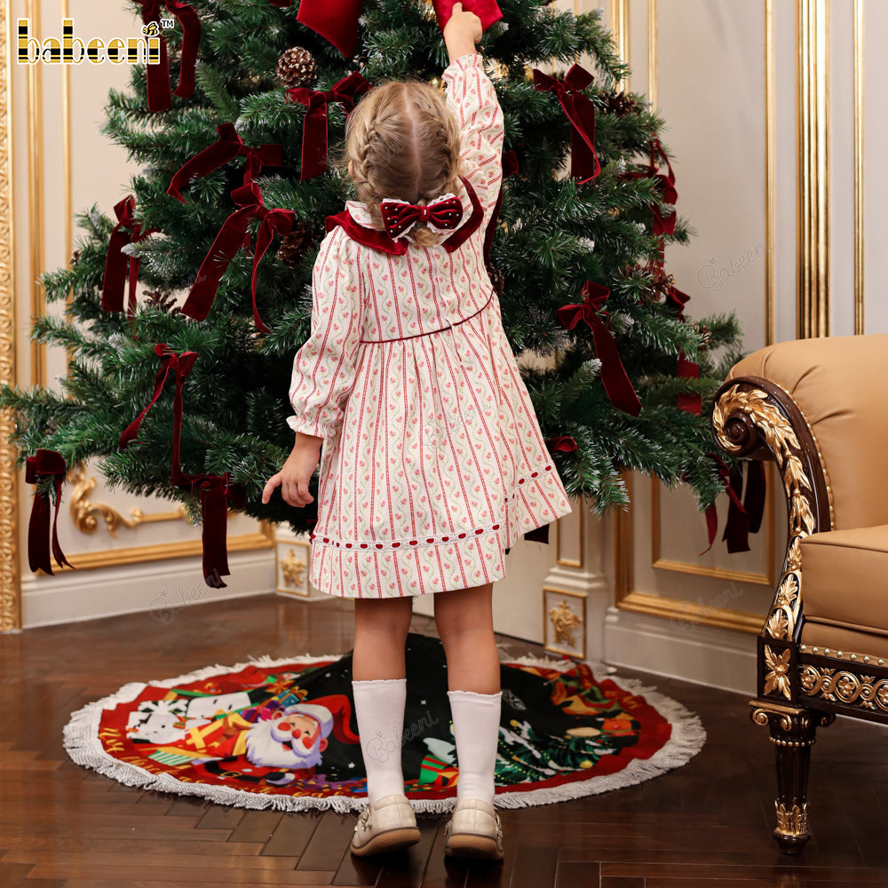 Features: Celebrate the season in this delightful A-line dress featuring a double-layer ruffle collar and a festive red velvet waistband. The sleeves are beautifully hand-embroidered and adorned with pearl accents, adding a touch of elegance. The skirt hem is trimmed with lace and finished with red velvet bows and threading, creating a truly charming holiday ensemble.