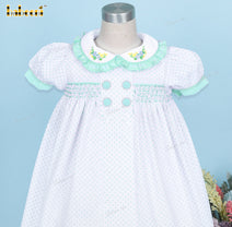 Features: A lovely honeycomb smocked girl dress with mint dots on white.