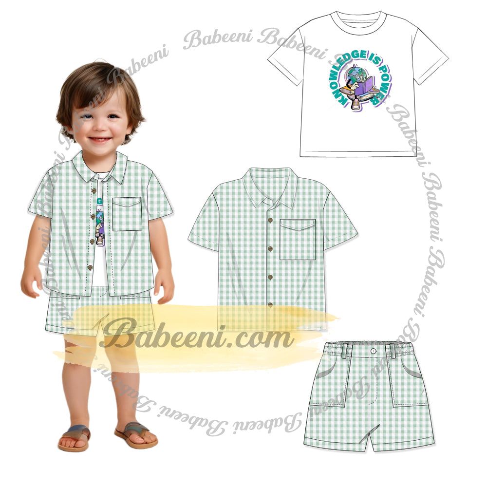 Feature: A stylish and versatile 3-piece outfit for boys, designed for layering or mixing and matching. The set includes a soft white cotton T-shirt printed with a cheerful school-themed motif, paired with a green checkered seersucker short-sleeve button-down shirt that doubles as a light jacket.