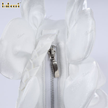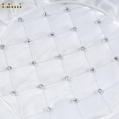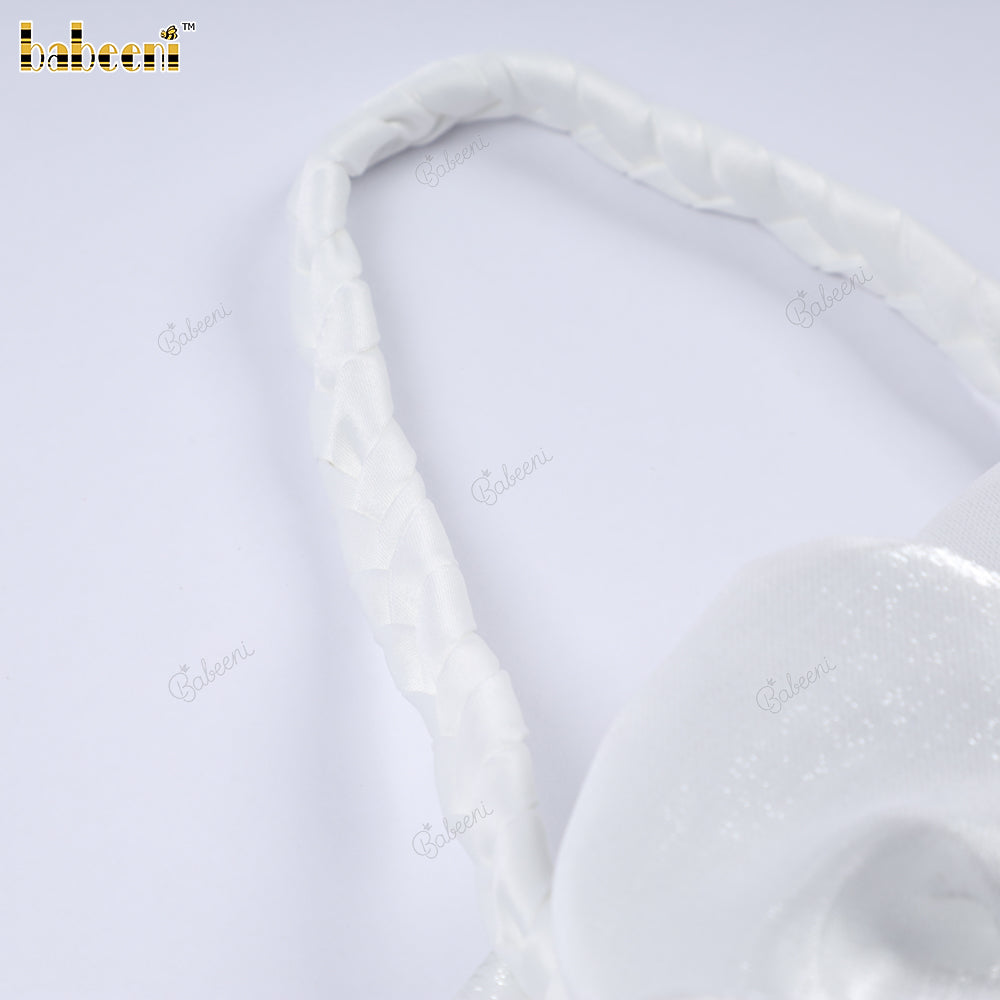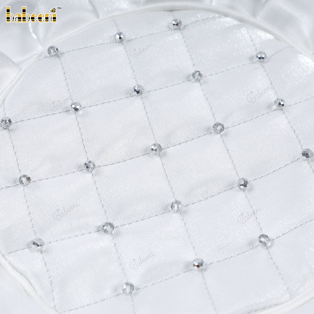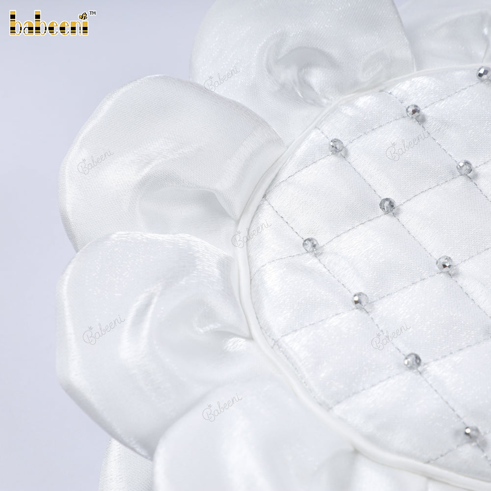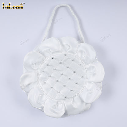 Feature: Taffeta bag with silk braided strap, silver thread quilting, and beaded sunflower-inspired design.