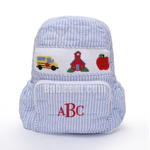 Feature: Lovely Smocked bus quilted backpack for kids with a monogrammed pretty front bus and house hand-smocked pattern. Quilted fabric